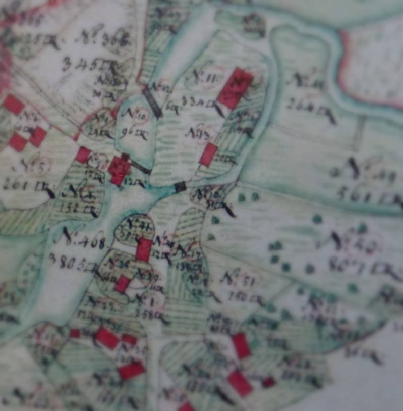 Die Karte zeigt im Gegensatz zur heutigen Dorfstruktur Ahrenshagen als "Weiler", also als ungeordnete Dorfanlage. Es gab zu dieser Zeit noch keine Gutsgebäude und ach die Büdnerei existierte noch nicht.